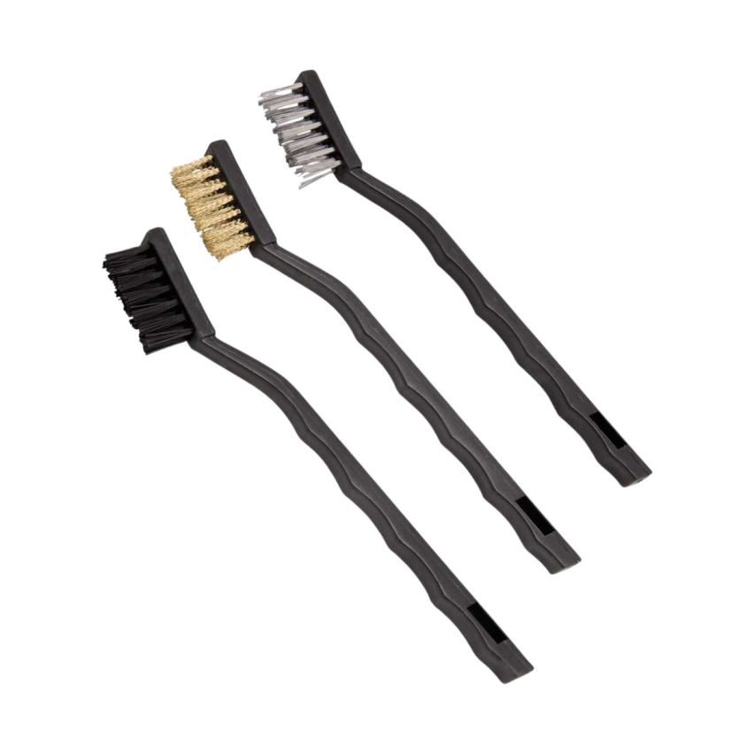 1 Jogo com 3 escovas manuais com cabo de 175 mm de comprimento sendo 1 escova com cerdas em latão 1 escova com cerdas em aço inoxidável e 1 escova com cerdas em nylon