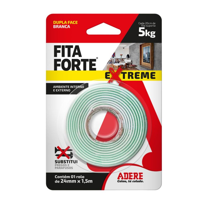A Fita Forte Extreme é uma dupla face espuma branca de alta resistência que permite aplicações PESADAS de maneira prática sem furar a parede