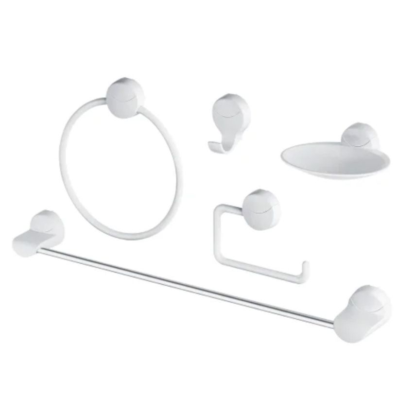 - Kit com 5 peças: cabideiro, saboneteira, toalheiro de rosto, papeleira e toalheiro de banho.