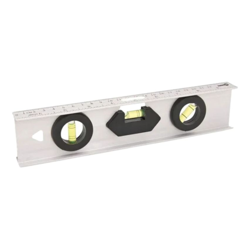 Possui corpo em alumínio, conferindo maior leveza e 3 bolhas, sendo 1 para nivelamento vertical, 1 para nivelamento horizontal e 1 para nivelamento 45º.